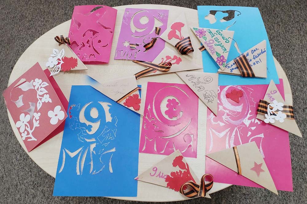 Кроме «солдатского треугольника», ребята оформили открытки к празднику 9 Мая, макеты которых были представлены в различных техниках. Создавая своими руками письма и поздравления, они стремились передать частичку благодарности ветеранам Великой Отечественной войны за мир, в котором мы живём.