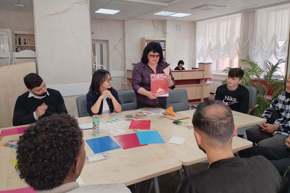 Библиотекарь отдела образовательных пространств Научной библиотеки имени Н.Н. Страхова Ольга Анохина рассказала молодым людям об истории «солдатского треугольника».