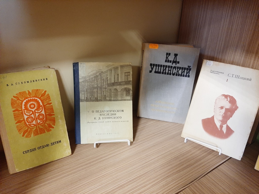 На выставке широко представлены избранные труды выдающихся отечественных педагогов: В.И. Водовозова, П.Ф. Лесгафта, А.С. Макаренко, А.Н. Острогорского, В.А. Сухомлинского, С.Т. Шацкого, К.Д. Ушинского.