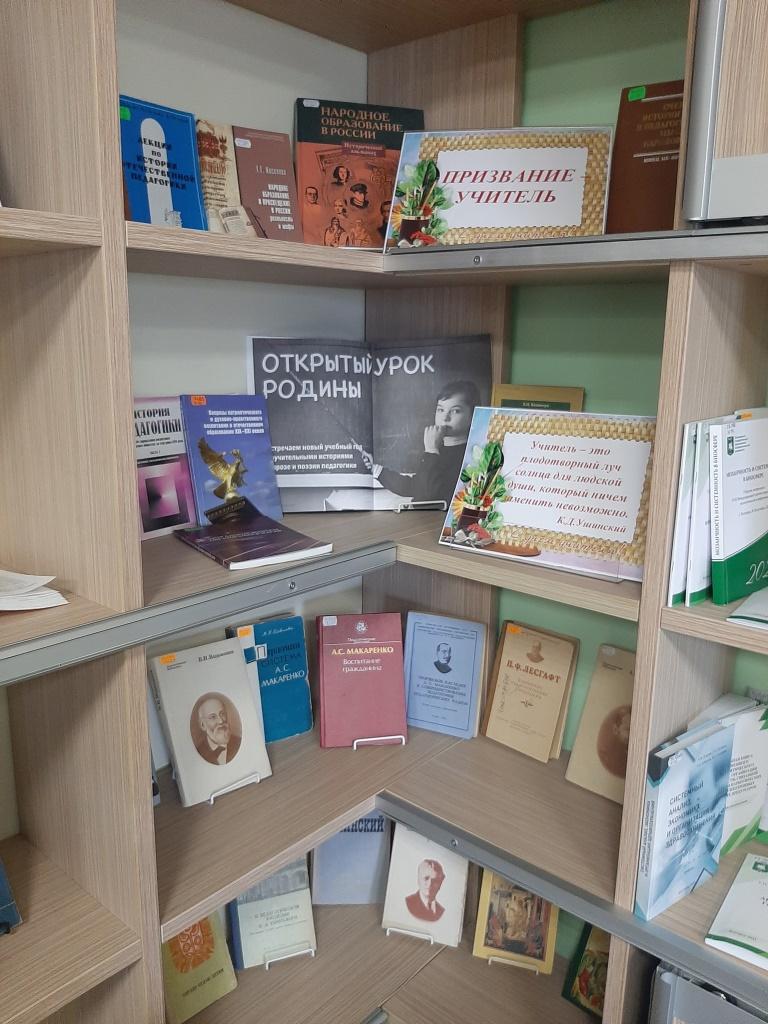 Экспозиция включает научную литературу, энциклопедии, периодические издания из библиотечного фонда. Значительное место занимают книги об истории педагогической мысли и становлении педагогической науки: «Педагогическая наука: теория и практика: коллективная монография / под общ. ред. В.Н. Правдюк (2014); Л.Н. Беленчук «История отечественной педагогики» (2005); «Народное образование в России: исторический альманах» (2000) и др.
