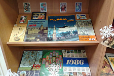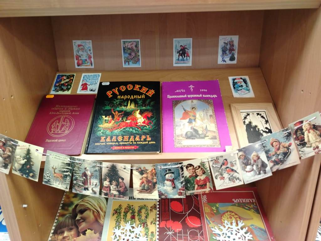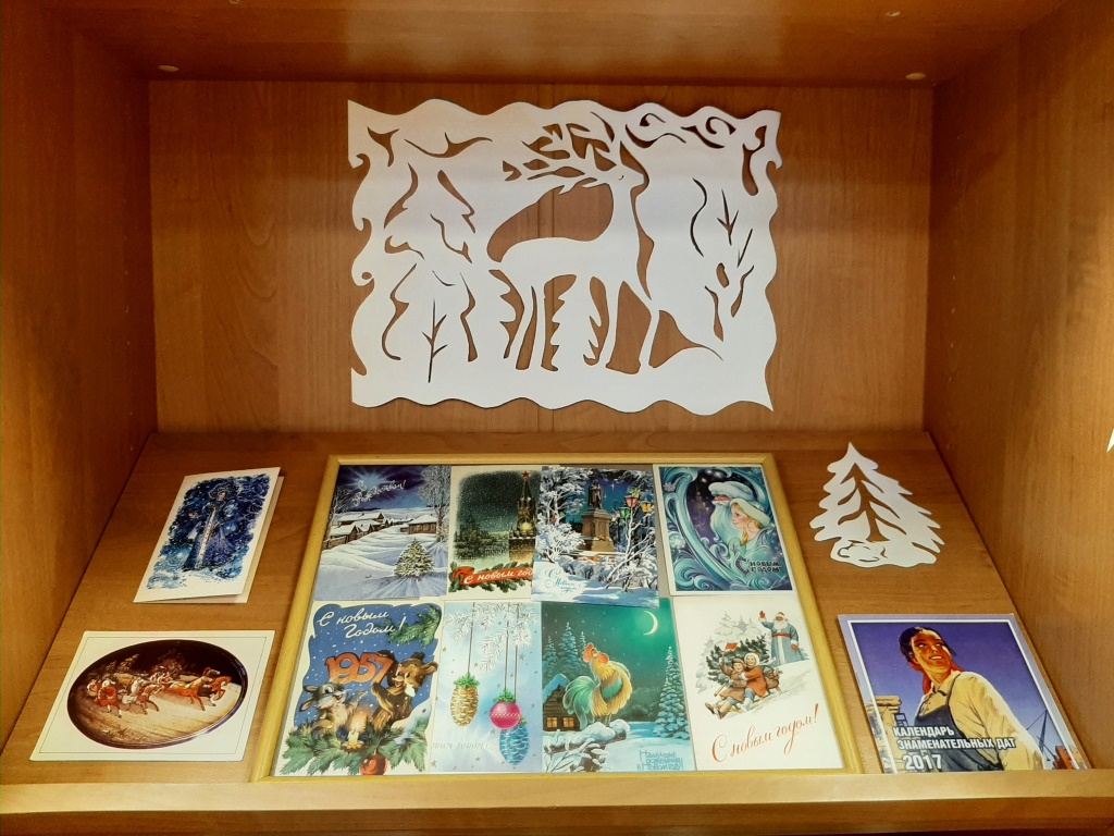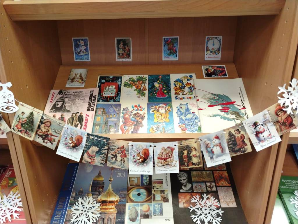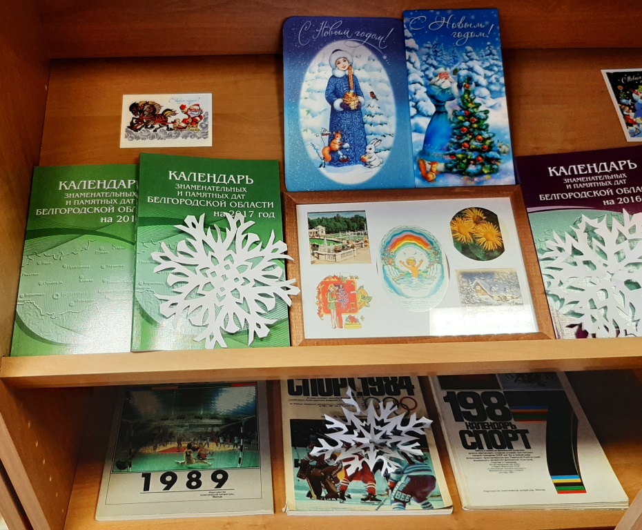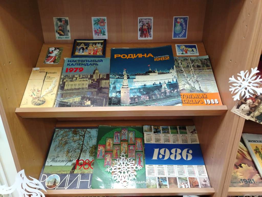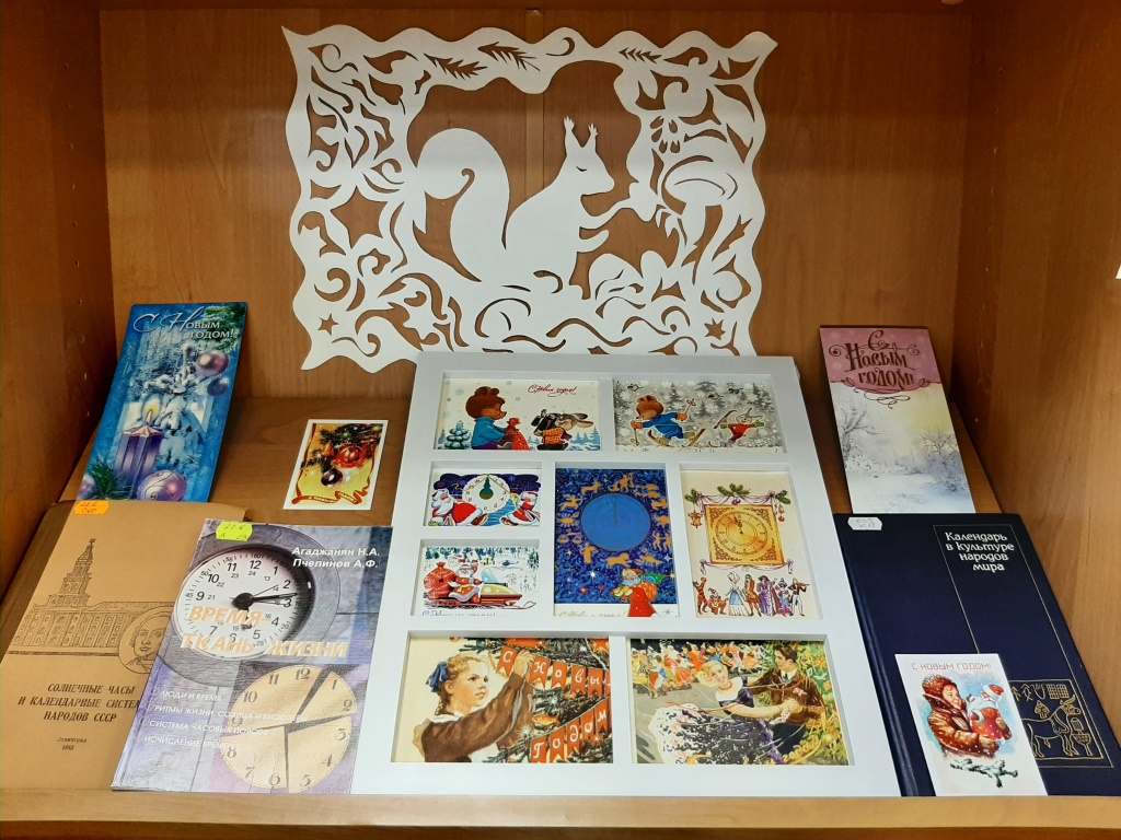 Представленные на экспозиции книги о времени и календарях, различные виды календарей, новогодние открытки советского периода предлагают окунуться в предновогоднюю атмосферу.