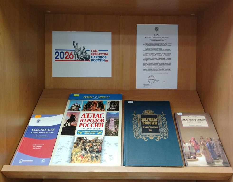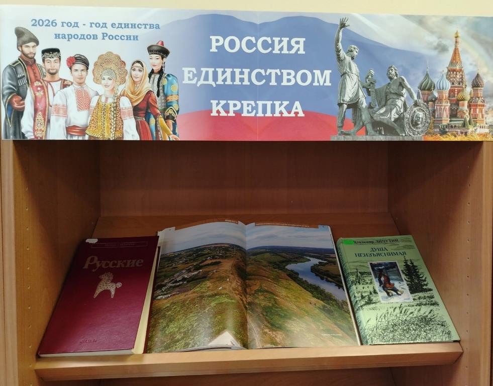 По решению президента РФ Владимира Путина 2026 год объявлен Годом единства народов России. Этому событию посвящена книжно-иллюстративная экспозиция «Россия единством крепка». В экспозиции представлены энциклопедические издания, справочники, монографии, уникальные фотографии о народах Российской Федерации.
